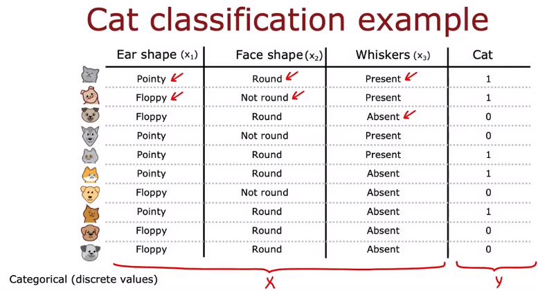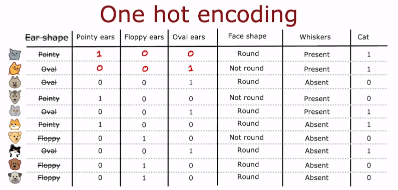ex) Ear shape(x1)이 pointy, oval, floppy로 3가지 가능한 값이 있을때, 원핫코딩이라는 방법을 사용한다.
