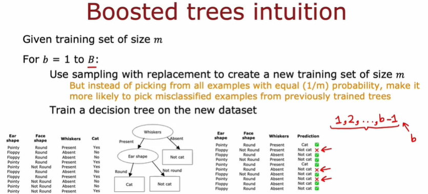 피아노를 배울 때 틀렸던 부분만 연습하는것 처럼, 이전 모델의 결과를 보고 not yet doing well인 subset of data에 집중하여 input 데이터를 뽑아낸다. b=B일때, b=1, 2, ... B-1의 tree 결과를 참조하여 still not doing well data를 뽑을 확률을 높여서 new tree에 학습하는 방법을 통해 더 빨리 정확도가 높아지도록 하는 것이 부스팅 알고리즘의 원리이다.