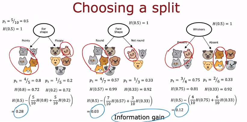 Ear Shape, Face Shape, Whiskers 변수에 대해 split 했을때의 entropy를 위의 그림에서 확인할 수 있다.