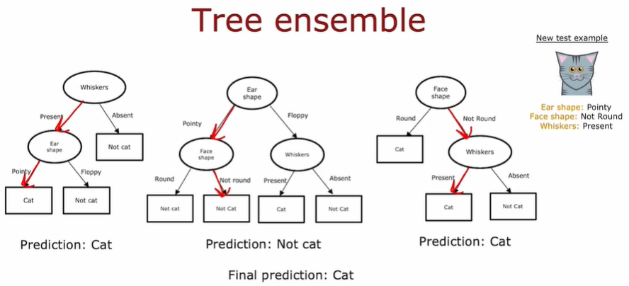 단일 의사결정트리의 단점은, highly sensitive(not robust)하다는 것이다. 예를 들어, 10개의 input data 중 1개를 cat에서 dog로 바꾸면 트리의 전체 형태가 달라진다. 이를 해결하기 위해서는 여러 의사결정트리를 옆으로 쌓아 많은 트리들의 더미를 학습하면 더 정확한 결과가 나온다.